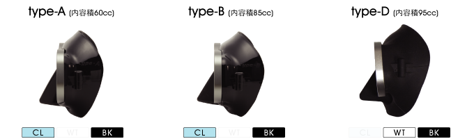 マスクの形はtype-A(内容積60cc)、type-B(内容積85cc)、type-D(内容積95cc)の3タイプ、カラーはクリアー、ホワイト、ブラックの3色から選べます。